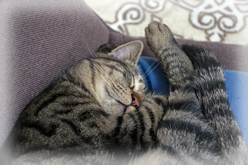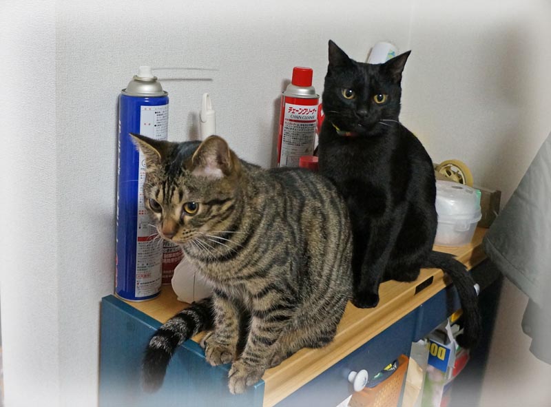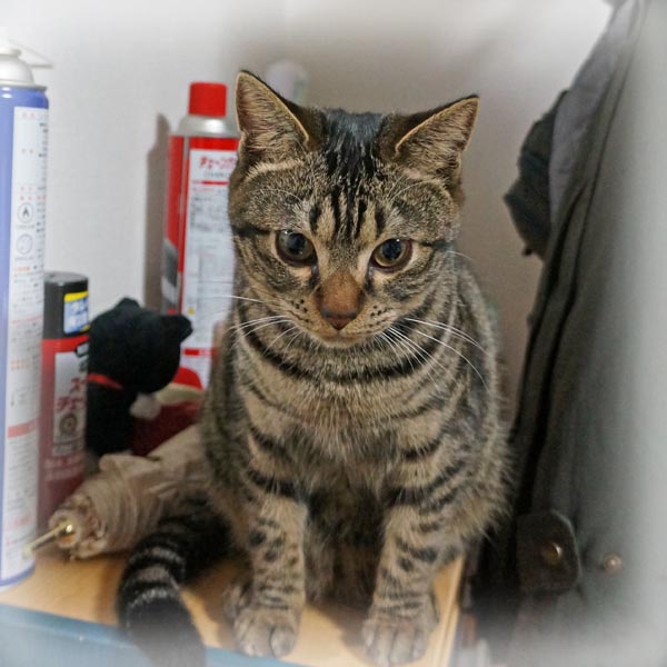 ここ、お気に入りにゃ。スプレーが邪魔にゃ。かつぼん、片付けてほしいのにゃ。