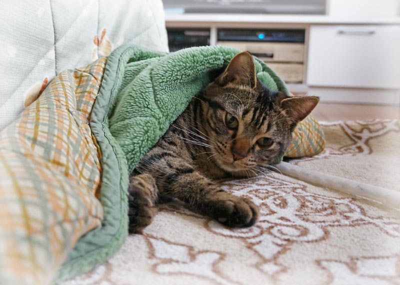 兄ちゃんがうるさいから、おこたで寝ようっと。