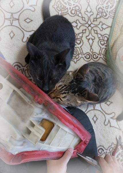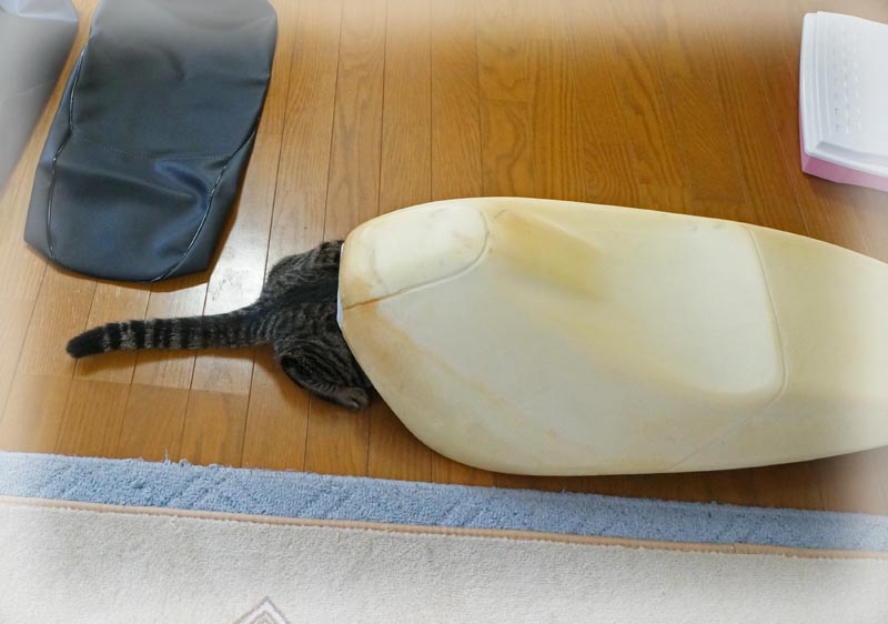 >表皮に穴が開いたので外して部屋に持って入って来たスクータのシートに