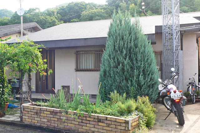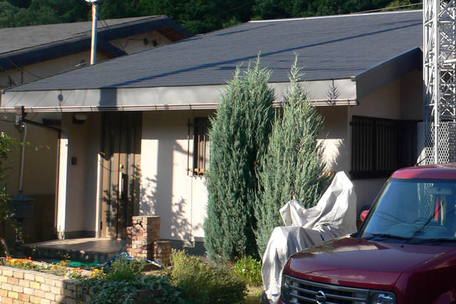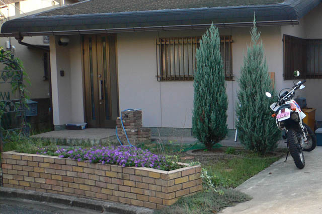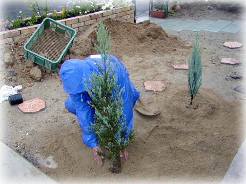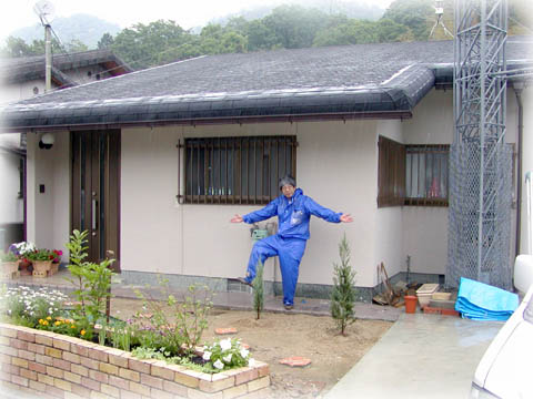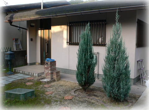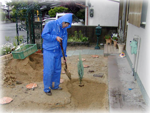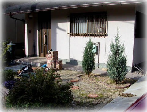 コニファーの後ろの窓のところ、うちのにゃんごが様子を見ていますね。 (2004/5/29)