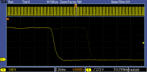 これ↓がTektronixのキャプチャ画面。Agilentの画面はTektronixよりはるかに綺麗で文字も読み易いです。 また波形の立ち下がり部分のジッタがよく見えません → 動画はこちら |