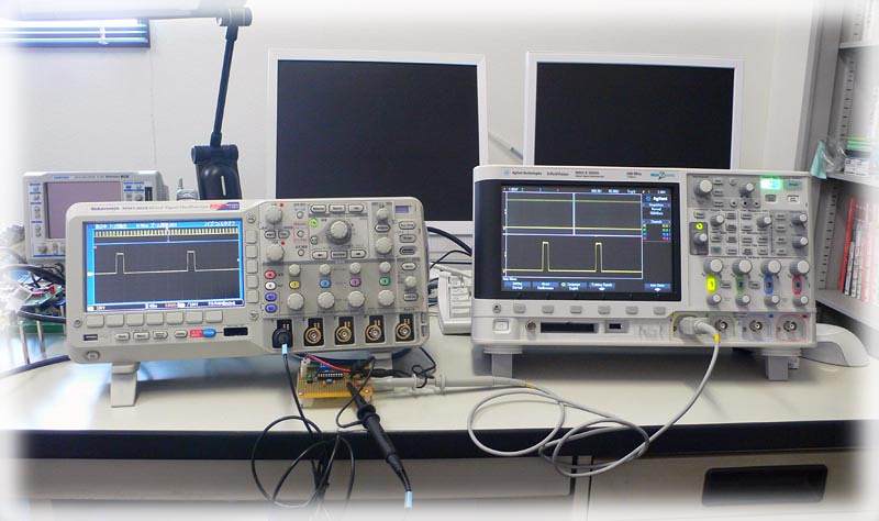 | ↑向かって左側がTektronixのMSO2024、右側がAgilentのMSOX2024Aです。 いずれも帯域200MHz、デジタル入力付き(mixed signal)で、私の欲しいものより グレードが上ですが、操作上は変わりありません。 Agilentの表示画面は大きくて高解像です Tektornix : 7インチ、480×240dot Agilent: 8.5インチ、800×480dot まずジッタの見え具合のテスト。 AVR Atiny2313を20MHzクロックで動かしてデジタル出力してみます。 200nsの正パルスが、256回に1回だけ250nsになります。 これ↓がAgilentのキャプチャ画面。波形の立ち下がり部分のジッタ(50ns)がよく見えます。→ 動画はこちら |