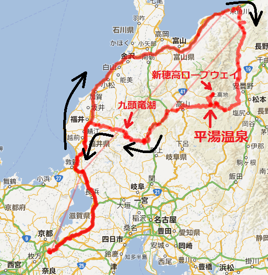 京滋BP → 名神高速道 → 北陸自動車道で一路、糸魚川IC。そこから南下。