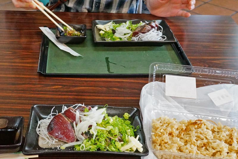 | 四国カルストから、高知・須崎へ。 高知と言えば、かつお。 『多田水産 須崎道の駅店』 でタタキを食しました。 藁に火を点けて、焦げ目を付けていました。 |